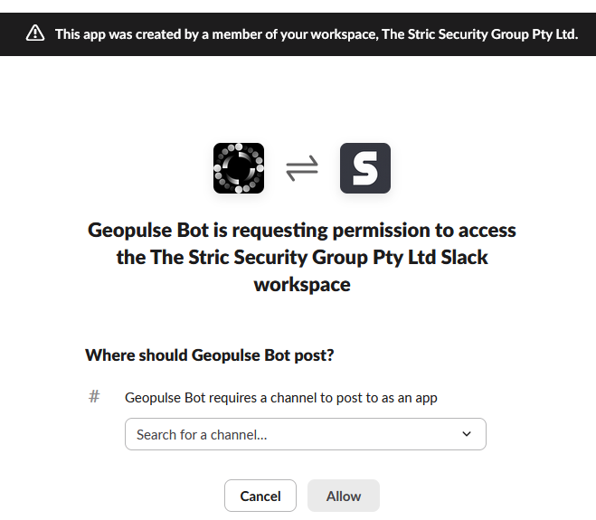 You'll be redirected to Slack to authenticate, and once authenticated, you can select which channel to post alerts to, shown below: