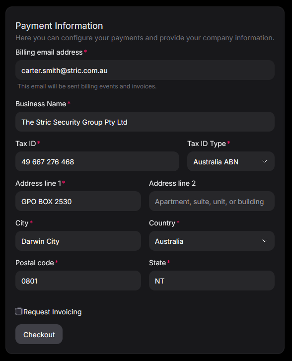 The billing email address input is where we'll send invoices and other emails related to payments. You might want this to be your email, or your accounts payable team.