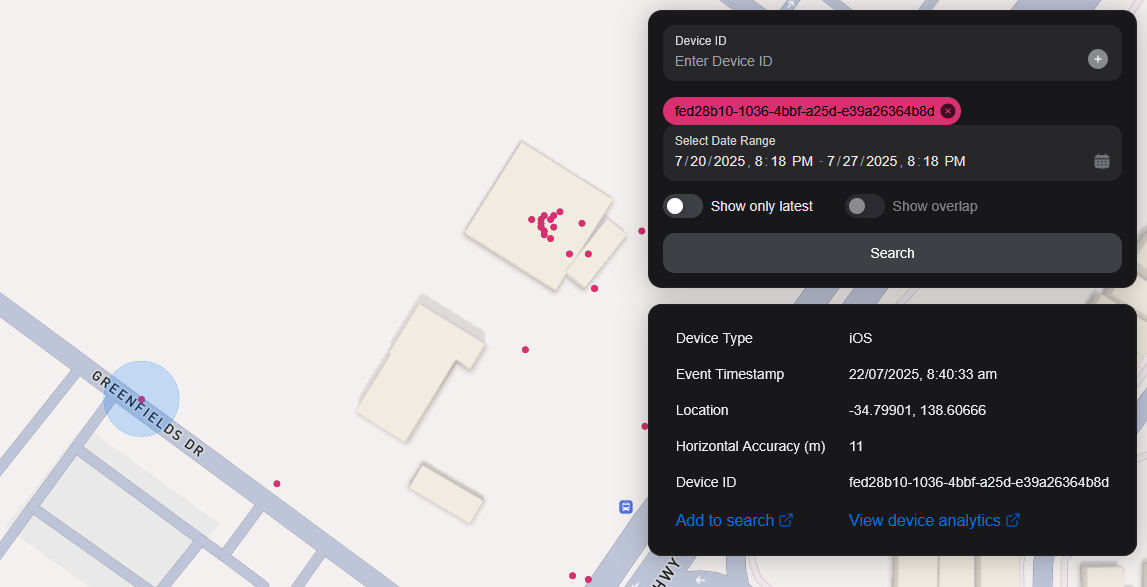 Each event contains information, such as Lat/Lon, Event Time, Horizontal Accuracy, IP Addresses (v4/v6). This event context is shown on the right pane, when you click on an individual device. In addition, an event's horizontal accuracy is shown as a light blue circle around the event.